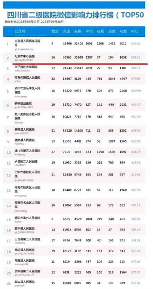 在2024年9月的四川省二级医院微信影响力排行榜中,万源市中心医院紧随甘洛县人民医院订阅号之后,排名第二。甘洛县人民医院订阅号以636.36的WCI指数位居榜首,而电子科技大学医院则排名第三。这一排名结果不仅体现了万源市中心医院在微信公众号运营方面的优势,也展示了其在全省二级医院中的领先地位。