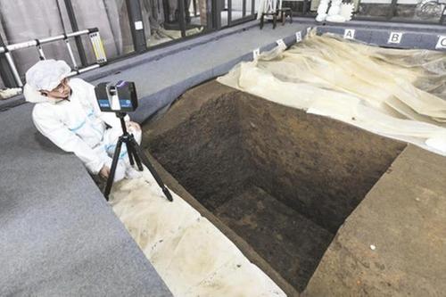 考古人员用三维激光扫描仪扫描三星堆7号祭祀坑